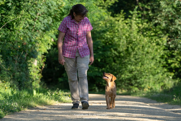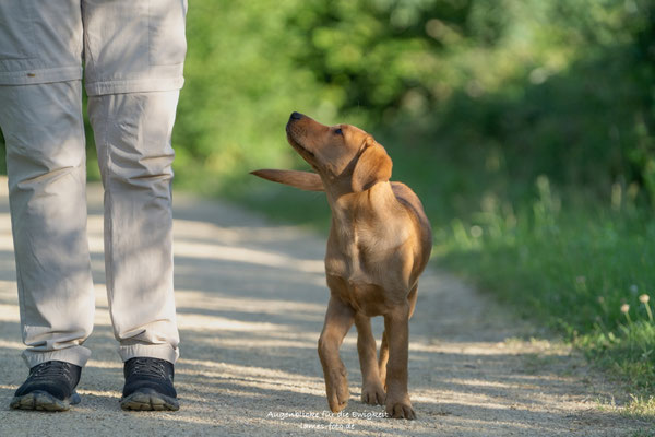 In Wiese, Wald und Feld genießen wir beim Spaziergang mit Dummyarbeit die tiefstehende Sonne